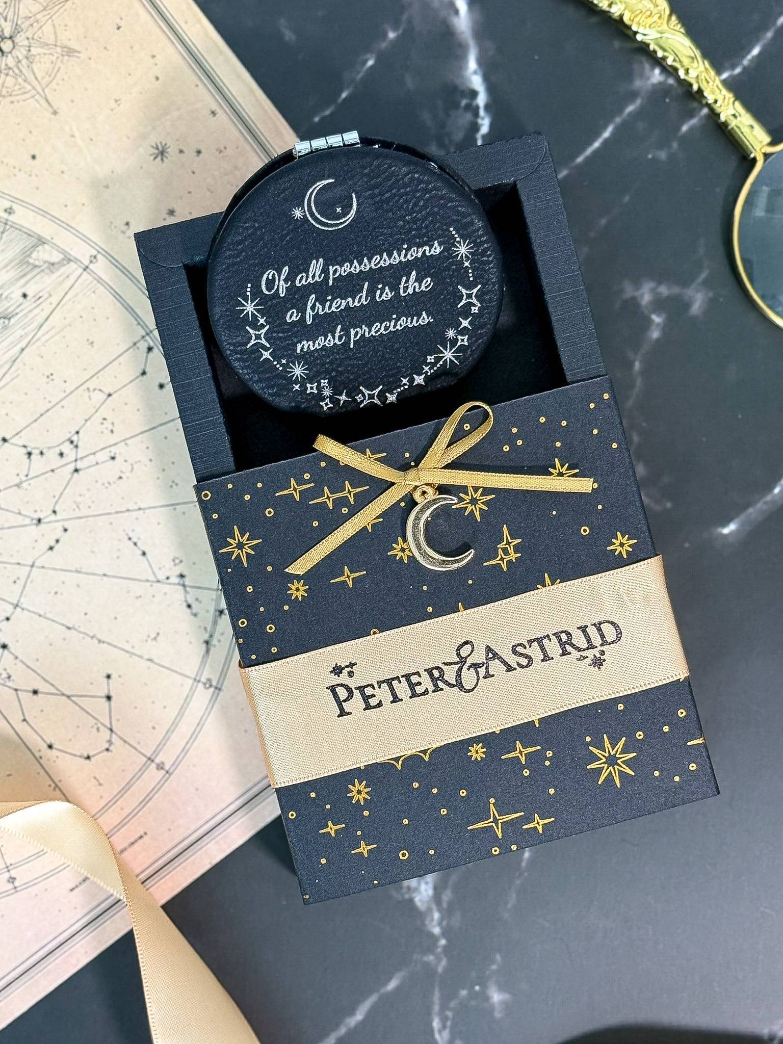 “Gift a touch of elegance with this faux leather compact mirror in black or white, a practical wedding favor with a luxurious leather-like finish without animal products. Perfect for guests who appreciate a stylish accessory. Select Standard personalization with the couple’s initials and wedding date engraved on the mirror, or choose our BeyondTheDay style: a sentimental quote or message from the couple engraved on the mirror, with wedding details elegantly presented on a custom sleeve—crafted for lasting use beyond your big day. Available in Romantic Peony, Chic Whimsy, Starlit Promises, or Monogram designs.”
