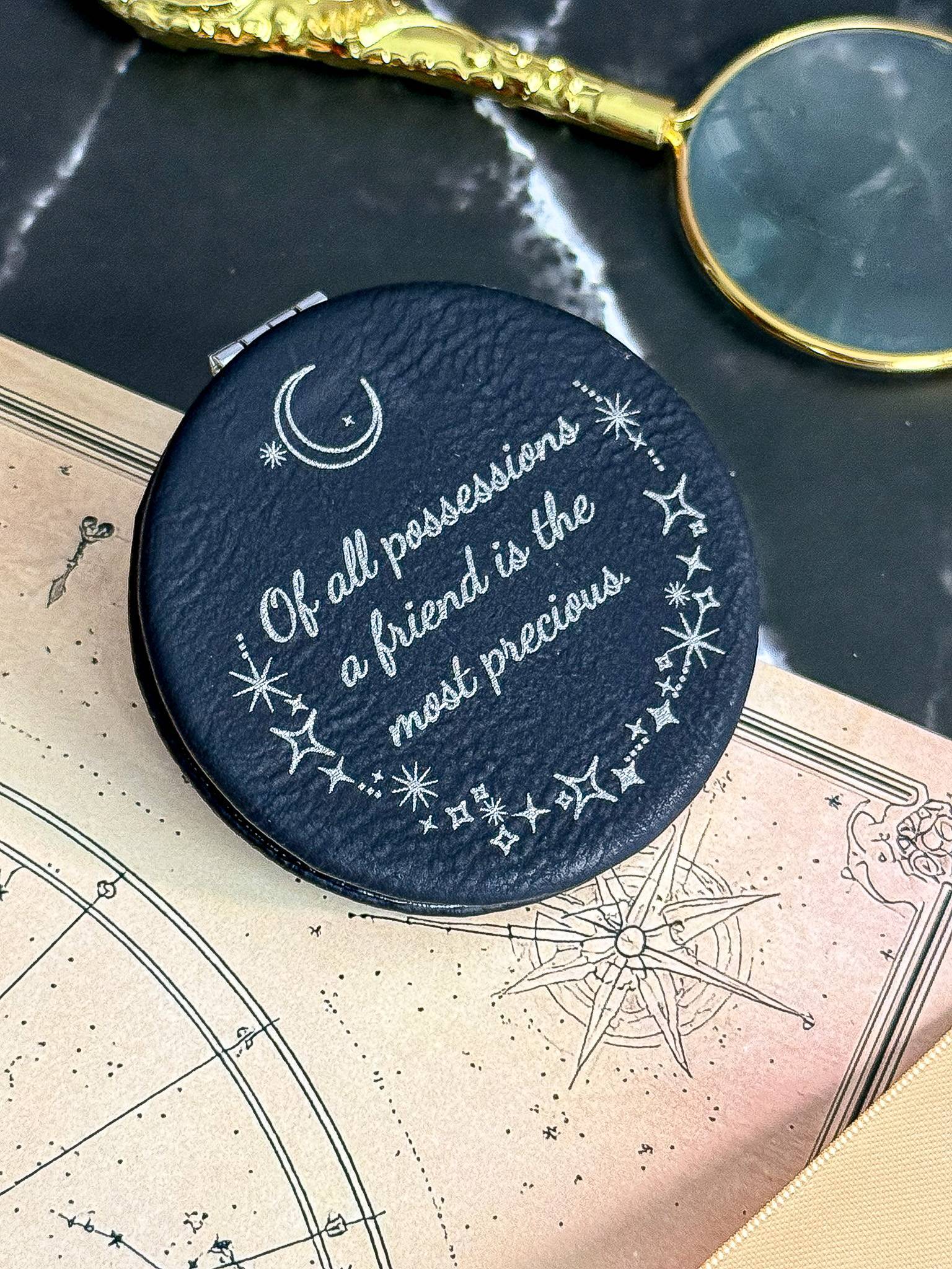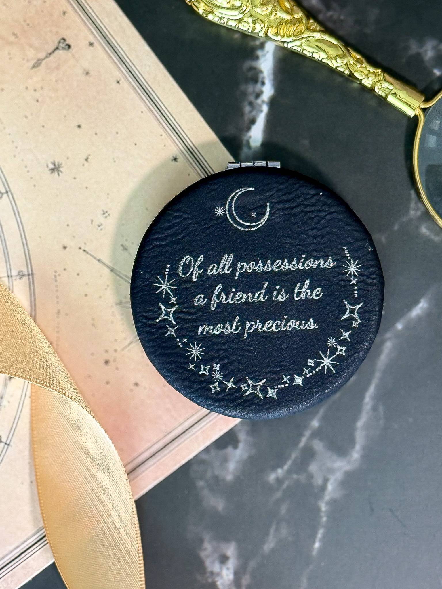 “Elegant faux leather compact mirror in black or white, ideal for wedding favors. Personalize with Standard or BeyondTheDay style in Romantic Peony, Chic Whimsy, Starlit Promises, or Monogram designs.”